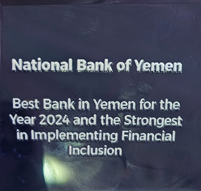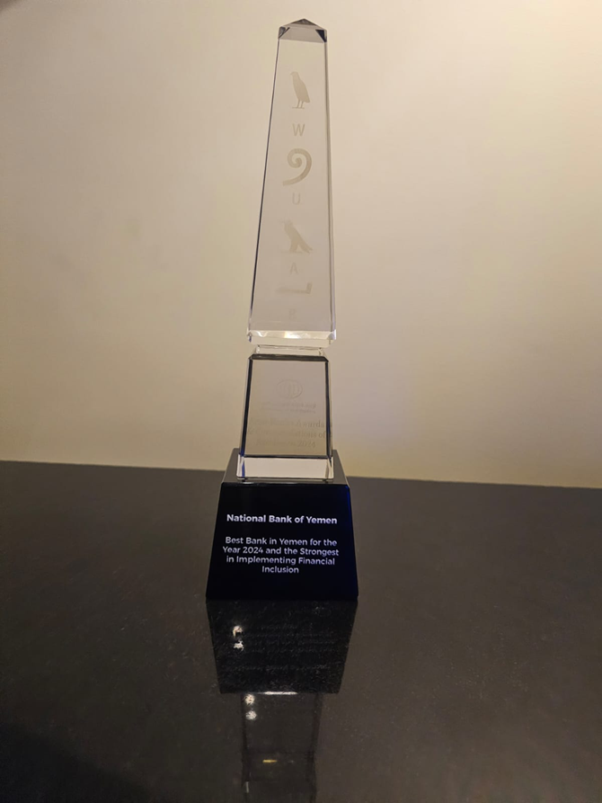 | The National Bank of Yemen won the award for Best Bank in Yemen for 2024, for the fourth consecutive year, from the World Union of Arab Bankers, as the best bank in Yemen and the strongest in implementing financial inclusion.