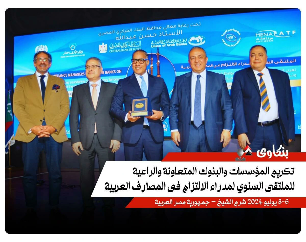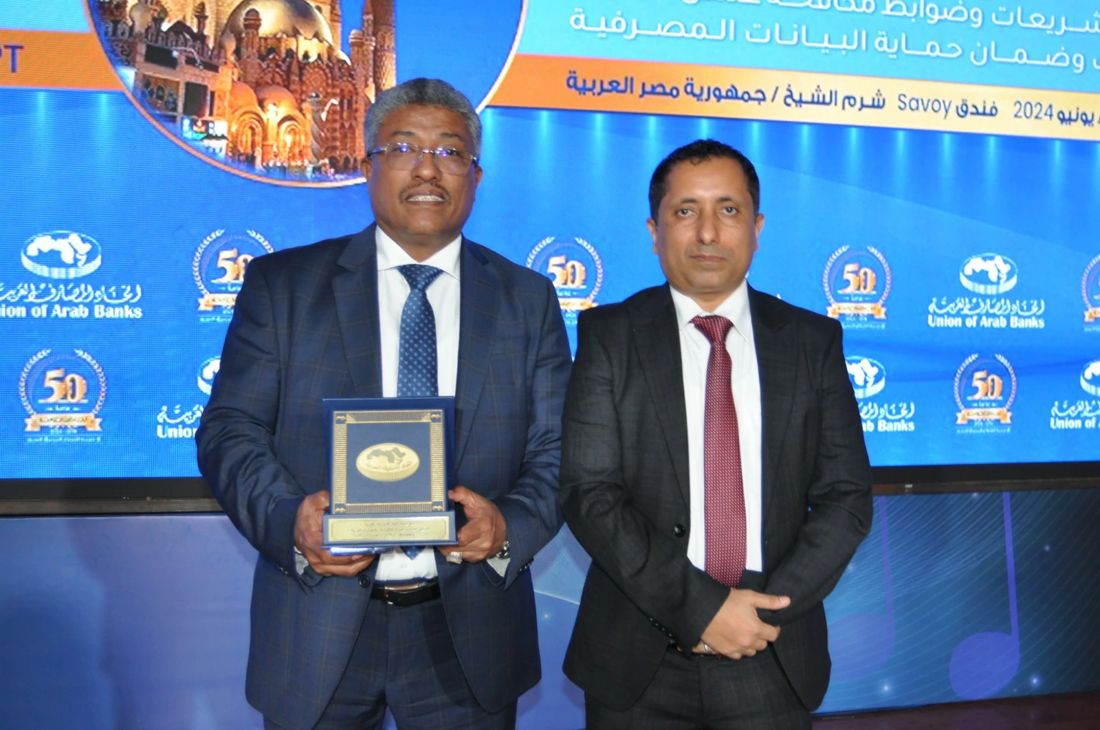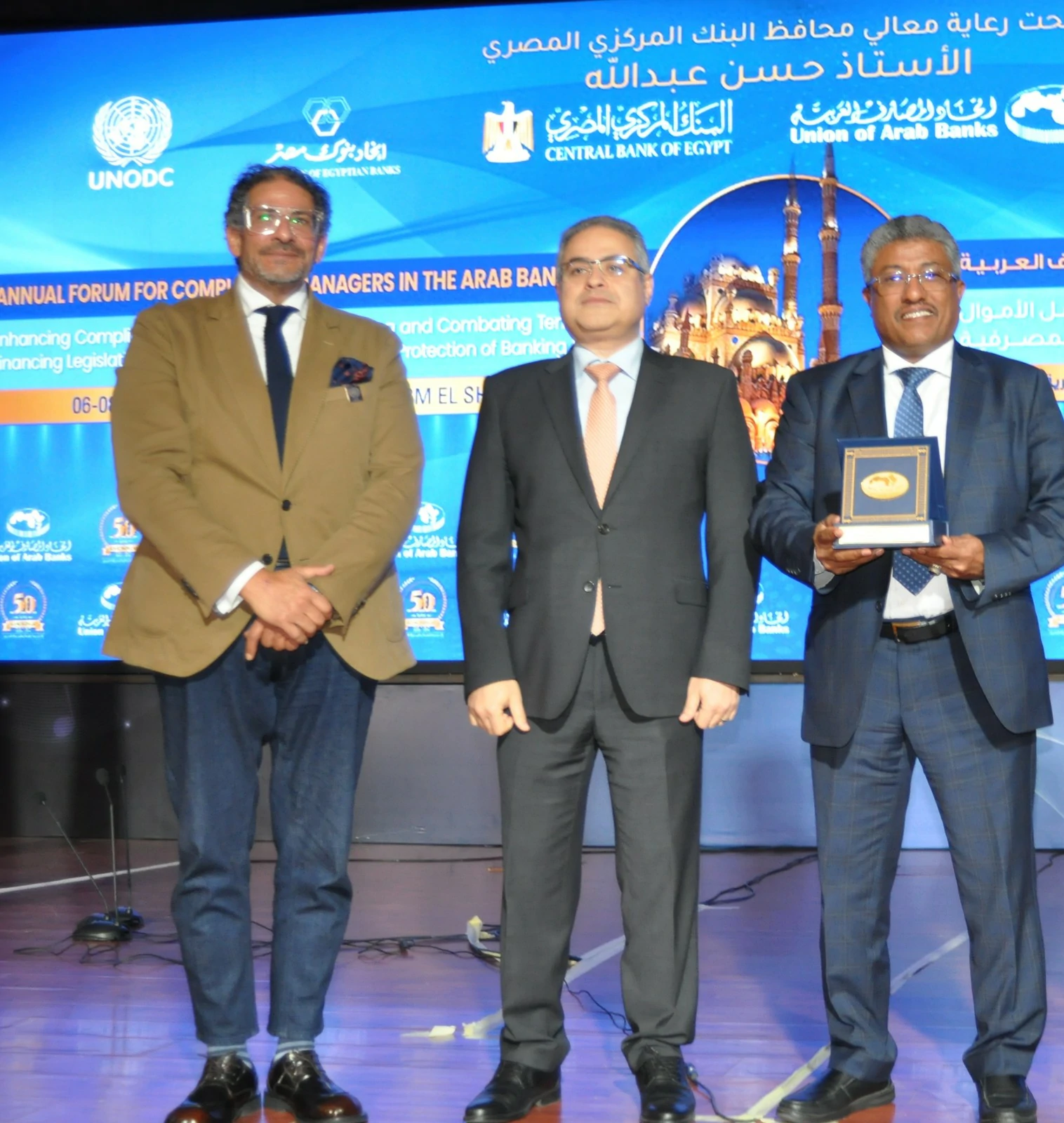 | The Union of Arab Banks honored Dr. Ahmed Ali Omar Bin sankr, General Manager of the National Bank of Yemen, a member of the Union of Arab Banks' Board of Directors, and representative of Yemeni banks. Held at the conclusion of the annual forum for compliance managers in Arab banks, the forum was organized by the Union in Sharm El-Sheikh, Egypt, under the title "Enhancing Compliance with Anti-Money Laundering and Counter-Terrorism Financing Legislation and Controls and Ensuring the Protection of Banking Data." The forum was held under the patronage of Hassan Abdullah, Governor of the Central Bank of Egypt, from June 6 to 8, and was attended by a host of Arab banking leaders and prominent figures. This honor is a culmination of Dr. Ahmed Ali Omar Bin sankr's efforts to enhance compliance and transparency standards in the banking sector, as well as his ongoing efforts to develop and improve banking performance in Yemen, contributing to strengthening financial and economic stability in the country. |