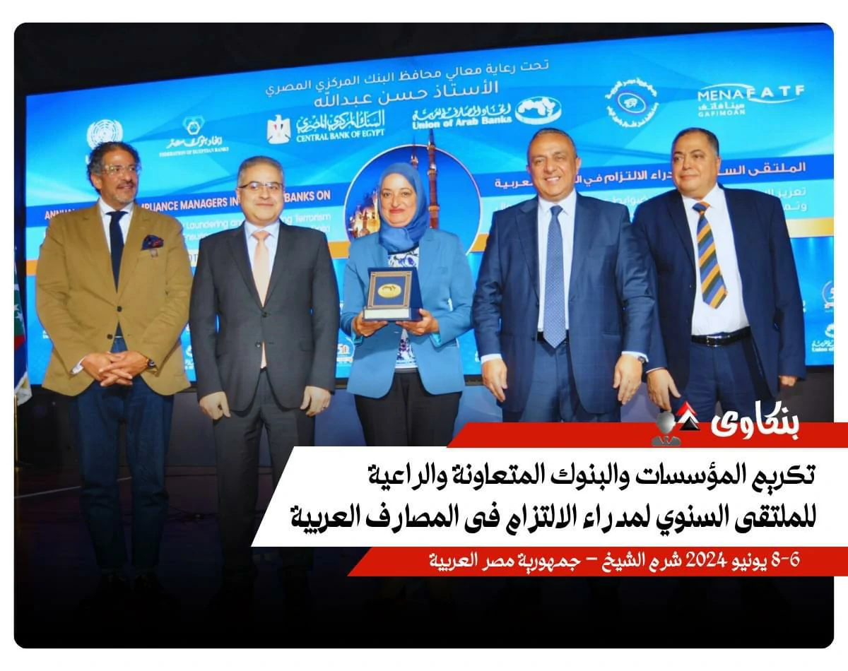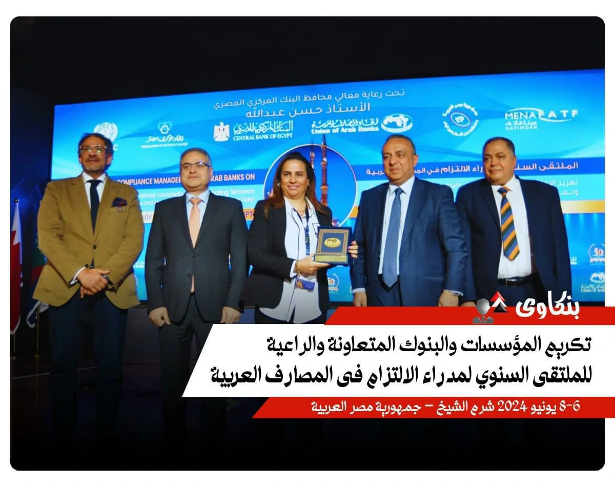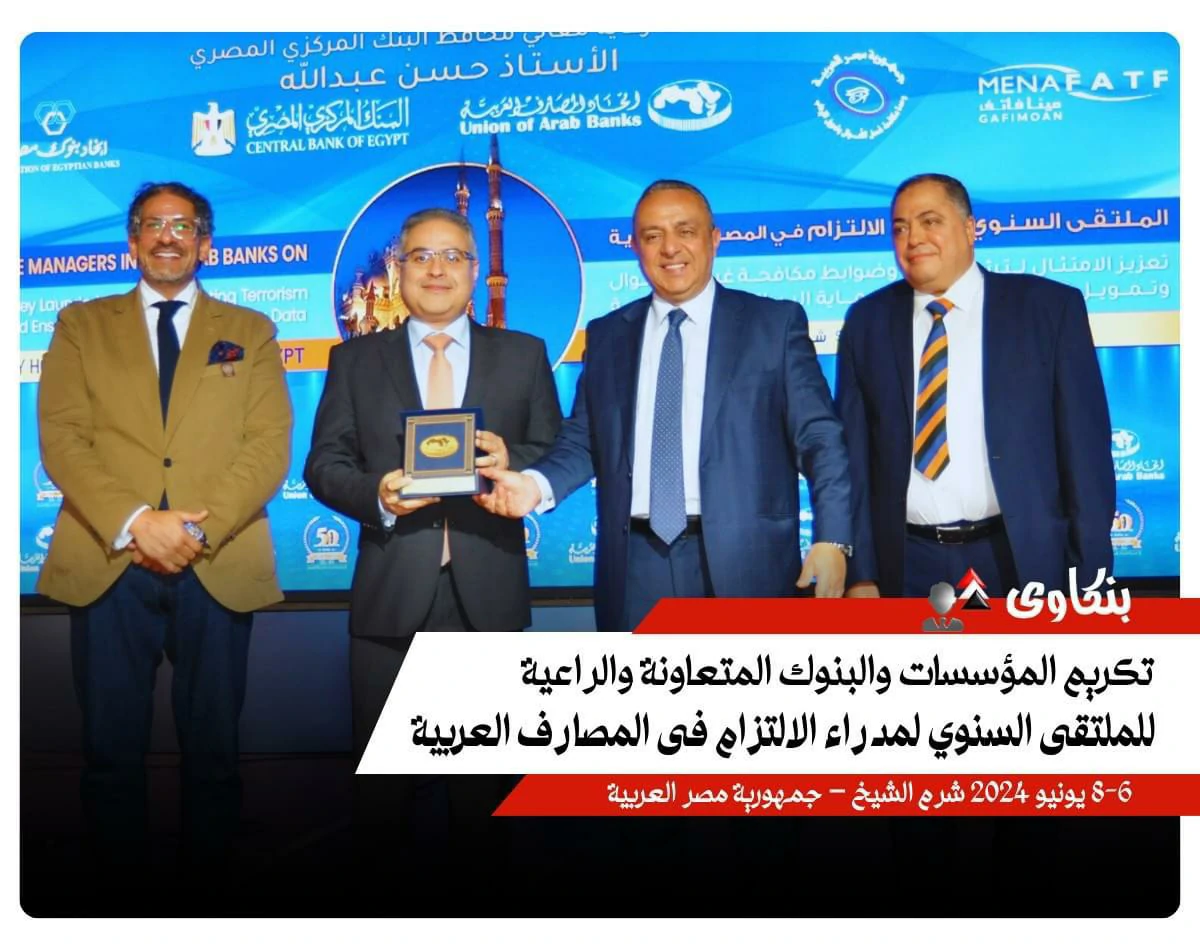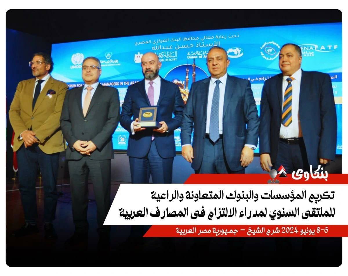| The Union of Arab Banks honored Dr. Ahmed Ali Omar Bin Sankr, General Manager of the National Bank of Yemen, a member of the Union of Arab Banks' Board of Directors, and representative of Yemeni banks. Held at the conclusion of the annual forum for compliance managers in Arab banks, the forum was organized by the Union in Sharm El-Sheikh, Egypt, under the title "Enhancing Compliance with Anti-Money Laundering and Counter-Terrorism Financing Legislation and Controls and Ensuring the Protection of Banking Data." The forum was held under the patronage of Hassan Abdullah, Governor of the Central Bank of Egypt, from June 6 to 8, and was attended by a host of Arab banking leaders and prominent figures.